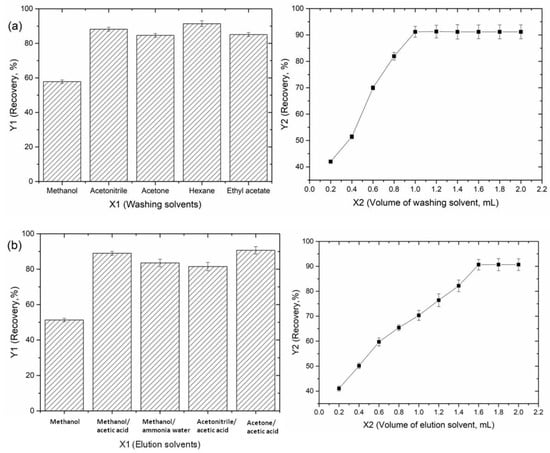 To remove interferents from matrix, different washing solvents, including methanol, acetonitrile, acetone, hexane, and ethyl acetate solutions, with different volumes (0.2–2.0 mL) were tested. The washing solvent was forced to pass through the system by regulating the vacuum of approximately 20 kPa to obtain a flow rate of 0.5 mL·min−1.