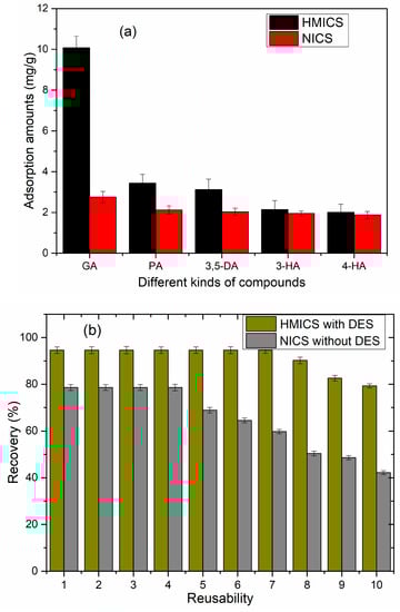Selectivity (a) and reusability (b) of HMICS with DES, and INCS without DES. (GA: Gallic acid; PA: Protocatechuic acid; 3,5-DA: 3,5-Dihydroxybenzoic acid. 3-HA: 3-Hydroxybenzoic acid; 4-HA: 4-Hydroxybenzoic acid)