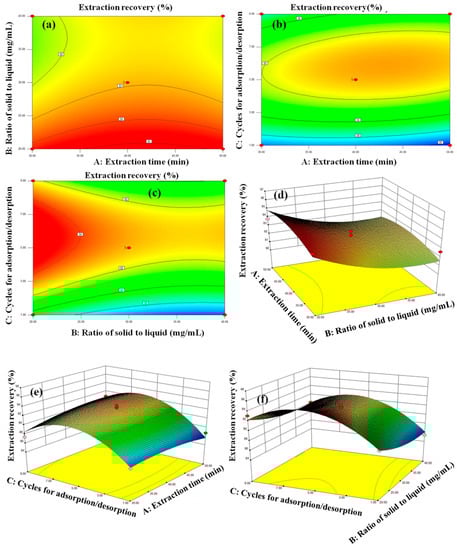 The contour plot and three-dimensional (3D) response surfaces were plotted to investigate the interactions among the variables (Figure 8). The extraction yield decreased with increasing extraction time ranged from 30 min to 50 min, increased with increasing solid to liquid ratio from 20 mg·mL−1 to 30 mg·mL−1, and then decreased from 30 mg·mL−1 to 40 mg·mL−1. Regarding the number of adsorption/desorption cycles, in the designed ranges of one to nine, the extraction recovery increased and then decreased. The theoretical maximum extraction recovery (94.6%) for GA was obtained at an extraction time of 30 min, solid to liquid ratio of 20 mg·mL−1, and five adsorption/desorption cycles. Under the optimal extraction conditions, the actual extraction recovery was 93.9%, which is close to 94.6%, highlighting the suitability and accuracy of the suggested models.