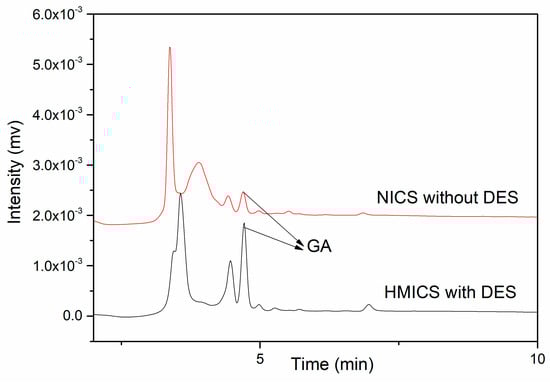 Extraction chromatograms of red ginseng tea extracts with HMICS with DES, and INCS without DES. (Column: C18 column, mobile phase: (Acetonitrile-0.05% phosphoric acid solution = 5:95, v/v), flow rate: 1.0 mL·min−1, UV: 270 nm, injection: 20 μL).