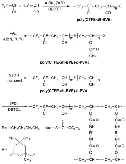 - Wang, P.; Dai, J.; Liu, L.; Dong, Q.; Wang, H.; Bai, R. Synthesis and properties of a well-defined copolymer of chlorotrifluoroethylene and N-vinylpyrrolidone by xanthate-mediated radical copolymerization under 60 Co γ-ray irradiation. Polym. Chem. 2014, 5, 6358–6364. [Google Scholar] [CrossRef]