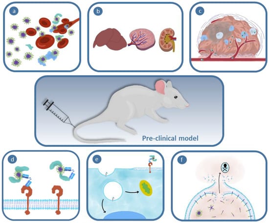 Given the importance of surface chemistry on the biodistribution and clearance of nanomedicines, recent interest has focused on developing multistep nanomedicine systems that can take advantage of multiple mechanisms for tumor accumulation. It is well established that the EPR effect plays some role (and in many cases the major role) in nanomedicine accumulation in tumor tissue [81]. This is often improved by incorporating targeting ligands towards tumor cell markers that allow for enhanced association with the tumor tissue (these processes are described in greater detail below). One issue with coating nanoparticles with proteins (e.g., antibodies, antibody fragments etc.) is that the injected nanoparticle no longer retains the stealthy characteristics of the nanomedicine (e.g., PEGylated structures), and recognition by the immune system following intravenous injection is exacerbated [82]. To overcome this, new approaches are being developed that utilize a “pre-targeting’ method that is well established in antibody molecular imaging. Here, the targeted system (e.g., antibody) is injected into the patient (or animal) and allowed to distribute and accumulate depending on the biophysical characteristics of the molecule. Following a defined period of time depending on the known pharmacokinetics of the molecule, a second molecule is injected that will have fast clearance, unless it undergoes a chemical reaction with the initial probe molecule. By incorporating imaging modalities on the second molecule, signal-to-noise ratios can be significantly enhanced owing to the much lower background signal present [83,84,85]. By utilizing bio-orthogonal chemistry approaches, this technique can also be translated to therapeutic delivery and offers exciting new methods for improving nanomedicine efficacy, while decreasing off-target effects [86,87]. It is expected that such methodology and approaches will become more popular in nanomedicine therapeutics into the future.