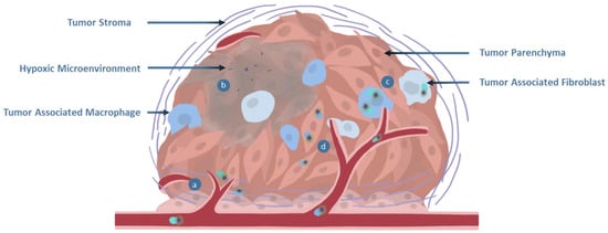 Obstacles associated with tumor accumulation: (a) Poor diffusion through tumor stroma; (b) premature exposure to delivery stimulus in a hypoxic microenvironment; (c) uptake by tumor associated cell populations (e.g., fibroblasts); and (d) nanoparticle uptake only within nearby target cells rather than homogeneously throughout the malignant mass.