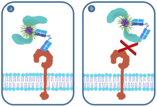 Schematic demonstrating the impact of opsonization on targeting efficiency: (a) Desired targeting, wherein binding is maintained; and (b) binding hindered by interactions with non-specifically bound protein.