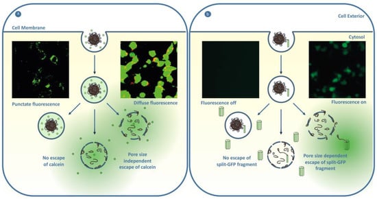 Schematic representation of the current and emerging methods to determine endosomal escape. (a) The calcein assay determines endosome escape via the transition from punctate to diffuse fluorescence throughout the whole cell. (b) The split-green fluorescent protein (GFP) assay generates a fluorescent signal after endosomal escape and reconstitution of the GFP-strand with the cytosolically-localized GFP. The split-GFP assay allows the endosomal escape of large therapeutics to be monitored, in contrast to the calcein assay, which can only represent the escape of small molecules. Adapted with permission from [187,203]. Copyright 2007, American Chemical Society. Copyright 2010, John Wiley and Sons.