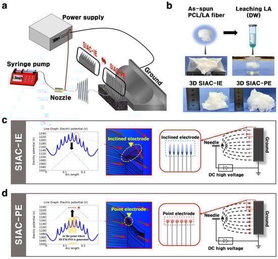 (a) Schematic illustration of electrospinning set up. (b) LA leaching process of PCL/LA fibers. Electric field analysis results of (c) SIAC-IE and (d) SIAC-PE.