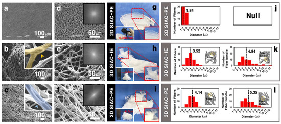 SEM (a–f) and photographic (g–i) images of three samples. FFT output images of the corresponding SEM images (inset of d–f). The thickness of the scaffolds in digital photographs (inset of g–i). (j–l) Diameters graphs of fiber and bundle type of each sample.