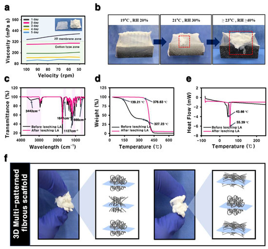 (a) Viscosity of PCL/LA solution by increasing mixing time. (b) Photographs of fibers dependent on RH and temperature. (c) FT-IR, (d) TGA, and (e) DSC analysis of the fibers (f) Photographs of the 3D cotton-type fibrous scaffolds with customized patterns.