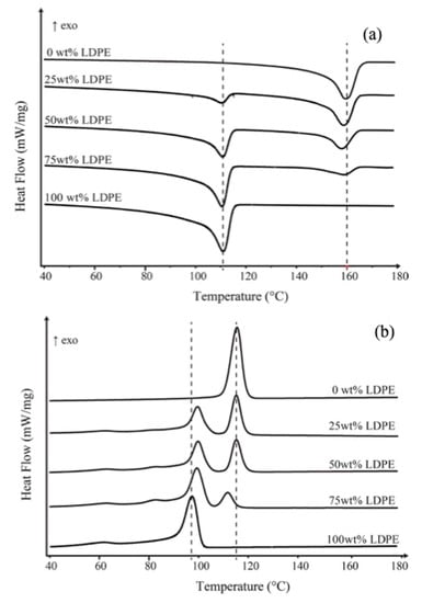 According to the rule of mixtures, the crystallinity of PP/LDPE blends was determined from the melting enthalpy [25]. The actual melting enthalpy of a blend is related to the enthalpy of the individual polymer and to their weight fraction w in the blends: