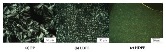 PP is a semi-crystalline thermoplastic polymer with a high degree of crystallinity due to its regular chain structure. In general, PP can crystallize in a wide range of spherulite dimensions (from 10–50 μm to 280–370 μm) depending on the crystallization conditions as well as the presence of nucleating agent [27,28]. LDPE and HDPE crystals, in general, consist of ethylene units in a chain fold structure. Thus, the segment length of an ethylene unit can limit the lamella thickness. From this study, it is visible that LDPE crystals are much smaller in size compared to PP crystals. The crystal sizes are about 25 and 100 μm in diameter for LDPE crystals and PP crystals, respectively. However, the crystal sizes of HDPE are much smaller than those of PP and LDPE as can be observed in Figure 4.