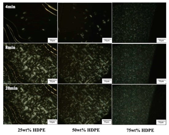 The phase transformation of PP, LDPE, HDPE and their blends was investigated using an Olympus IX71 polarising optical microscope (Melville, NY, USA) equipped with a 50× objective and a hot-stage. All samples were prepared as 10 μm thick films using a microtome. The films were heated between a glass slide and coverslip to 200 °C and kept for 2 min. Subsequently, the samples were quenched to an isothermal temperature between the crystallization temperatures for PP (125 °C) and LDPE (100 °C).
