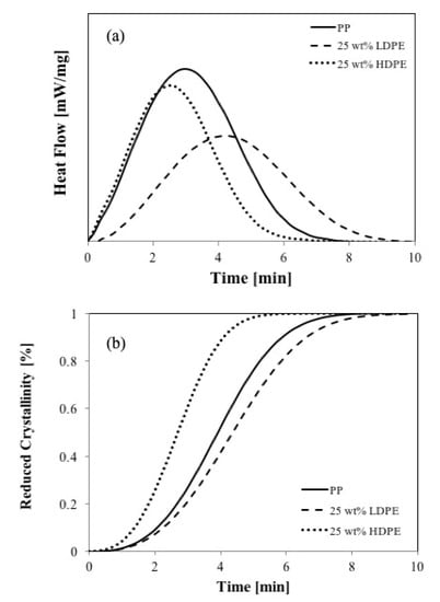 Figure 7a shows the crystallization behaviors, and Figure 7b shows the comparison of crystalline fraction development in PP/LDPE and PP/HDPE at the same concentration of LDPE and HDPE (25 wt %), respectively. The solid line represents the crystalline fraction of pure PP at the same isothermal crystallization process.