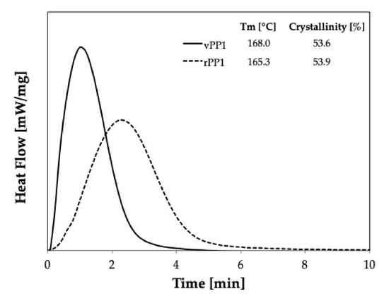 Crystallization curves obtained at 139 °C for virgin material (vPP1), and recycled material (rPP1).