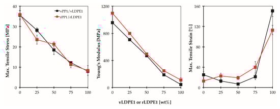 Tensile stress [MPa], Young’s modulus [MPa] and tensile strain [%] for vPP1/vLDPE1 and rPP1/rLDPE1 as a function of blend composition.