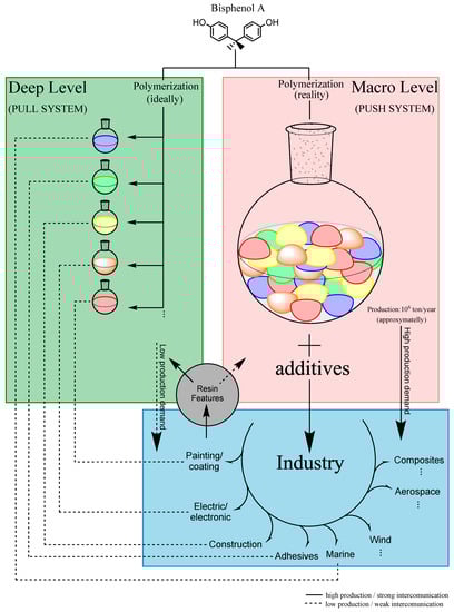 - Deep levels—optimize the synthesis parameters of the resins, leading to specific chemical and mechanical properties (green part of Figure 1);