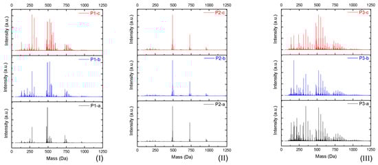 Electrospray Ionization-Time of Flight-Mass Spectroscopy (ESI-µ-TOF-MS) spectra of the triplicate reactions for each polymer profile. (I) P1, (II) P2, and (III) P3 reactions.