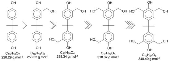 Once this polymerization reaction generates derivate products, it is not possible to achieve a “pure” polymer/oligomer, leading to the necessity to define what is considered as a “pure” polymer/oligomer, and what a derivate product is. For instance, the mer that has no other ramification besides the methylene connecting the monomers can be considered the “pure” oligomer; any other structures are then derivate products, which are variations in the end and in the reactive positions of the oligomer chains. Figure 4 represents a simplified version of the possibilities, without considering the reactions in all positions of the aryl ring and in the phenolic position, as well as representing the relative reactivity of each derivate/intermediate product.
