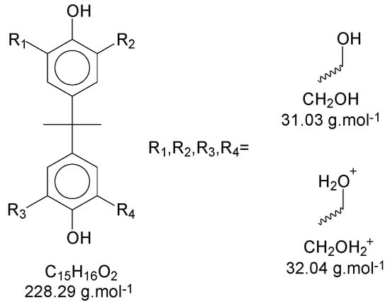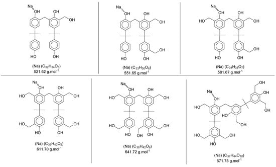 In Figure 5a, the intensity of the peaks is higher—for all mers—with the sodium adducts. During the polymerization reaction, the addition of formaldehyde molecules is randomly distributed in the ortho positions of the aryl ring, generating the derivate products with intervals of approximately 30 Da (taking into account that these radicals can be in different structures, presented previously in Figure 4). Figure 7 shows the structures for the secondary products in the dimer region, with the sodium adduct possibilities.