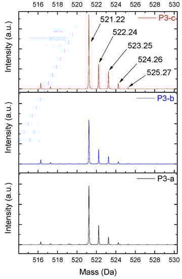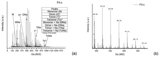 Taking, as an example, the spectra from the reaction P3-c (Figure 2), the masses of each neutral mer from the polymer were selected (Figure 6a). Then, in the mass region of the dimer, most of the possibilities for the secondary products were selected (Figure 6b). The sodium adducts that can be formed during the ionization step might also be considered [12,13,14,15,16].