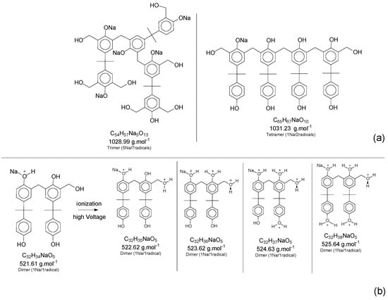 Although most of the peaks were identified with the theoretical values for adducts and derivate products, as presented in Figure 6, some values were in between two possibilities of structures, and even one single peak mass value can represent two distinct structures. This scenario can be explained by implications that should be considered for this characterization method, where, during the ionization step, the mass slightly changes the values, once the oligomers have several positions susceptible to being ionized (mainly the hydroxyl groups attached to the aromatic ring). To illustrate the concept, Figure 8 presents two situations: “a” is an example of two structures in the same range of theoretical mass and “b” represents the mass variations in the ionization step of the ESI-µTOF-MS spectroscopy in one of the tetramers identified. This assumption is only based on the ionization for the phenolic hydroxyl groups.