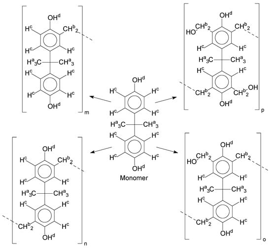 Once the region “b” is assigned for the methylene bridges, methyl-hydroxyl groups, and possible residues of unreacted p-formaldehyde (one can see this for P3, where the signal in the range of 9.5 ppm confirms the p-formaldehyde traces), precise assignment for each group is not achievable [17].
