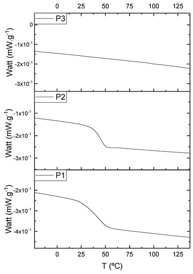 Comparing the samples, the DSC also shows three different profiles of heating behavior. The sample P1 presented Tg (transition glass temperature) starting at 30.7 °C, with 0.67 J·(g·°C)−1. The sample P2 exhibited Tg starting at 49.1 °C, with 0.71 J·(g·°C)−1. The sample P3 presented no Tg, indicating that there is no crystalline phase present in this material. Regarding the samples P1 and P2, the crystalline phase is more pronounced for the sample P2 [18]. These results seem to indicate the following behavior: once the concentrations of the secondary products increase, the crystalline phases decrease. The DSC supports the results of the other characterization techniques, although the samples are all based on the same monomer, and each polymer presented a different structure, molecular size, and properties [19,20].