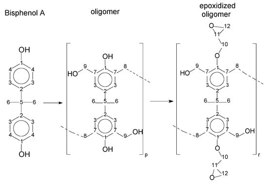 The amounts of epoxy resins were also evaluated by the carbon experiment, based on the work of Fleming (1985) [23]. The carbon spectra can help to distinguish the epoxy and methylene groups. In this case, the presence of secondary epoxy products (Figure 13) does not significantly affect the shifting signal. Figure 15 presents the chemical structures with numbered carbons. Table 5 presents the ppm values assigned for each carbon, for the Bisphenol-A, the oligomers, and their epoxidized products. The full spectra are presented in the supplementary material (Figures S8–S14).