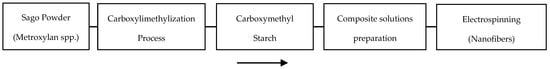 Processing route from a sago powder to electrospinning process to obtain the composite nanofibers.