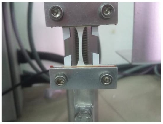 The composite PLLA/CMS/β-TCP nanofibers were formed into a rectangular shape (5 × 15 mm) with 10 mm of the gauge length for a tensile test. Samples were removed from the aluminum foil using a paper frame with double-sided tape attached to it. The frame provided additional support to the sample for handling during the testing process (Figure 3). Tensile testing was conducted by using 20 N load cell (Model UUK 5, Chungcheongbuk-do, Korea) equipped with a micro-stepper motor system (Ezi Step, Fastec, Bucheon, Korea) and an OMRON RXRX25 data logger to record the load. The elongation was determined by a 1.0 mW Omron laser detector with a detection limit of 2.5 ms/600 nm. The tensile test was conducted at 0.5 mm min−1 of the crosshead velocity. The tensile strength was taken as the maximum stress of the stress–strain curve.