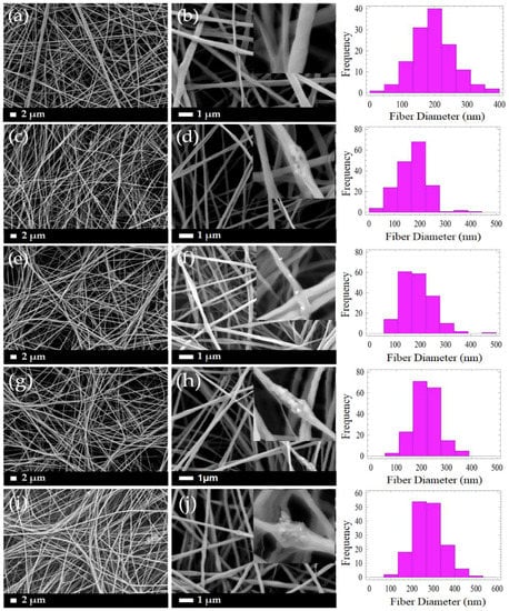 Morphology of the PLLA/CMS/β-TCP composite nanofibers with different compositions of β-TCP at different magnifications of 2000× and 10,000× (a,b) PLLA/CMS (c,d) 0.25% β-TCP, (e,f) 0.5% β-TCP, (g,h) 0.75% β-TCP and (i,j) 1% β-TCP in PLLA/CMS.