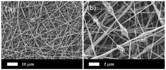 There are numerous techniques to fabricate nanofibers, including drawing, phase separations, template synthesis, self-assembly, and electrospinning [1,2,3,4]. In comparison, electrospinning, which has become an interest of a great many researchers, is a cost-effective and easy to control process which produces uniform nanofibers. Nanofibers produced by electrospinning provide a huge surface area to volume ratio, high porosity, and sufficient mechanical characteristics [5]. The distribution of fibers diameter and porosity is easy to control by controlling the processing parameters of electrospinning. This versatile technique is suitable for the fabrication of various formulations of nanofibers usable in multiple applications including filtration [6,7,8,9,10,11], drug delivery systems [12,13,14], the textile industry [15,16], or scaffolds for tissue engineering [17,18,19,20]. In biomedical engineering areas, nanofibers prepared via electrospinning provide valuable properties since the nanofibers mimic the extracellular matrix (ECM) which is important as a cell platform. Electrospinning involves three major components—a high voltage, a collector, and a syringe pump. High voltage provides an electrical field between the nozzle and the collector. A syringe pump pushes the polymer solution to the nozzle and controls the flow rate, whereas nanofibers are deposited onto the collector [21]. When the high voltage is applied, an electrical field is generated between the nozzle and the collector, the polymer solution is then electrically charged and drawn to the polymer jet due to a high potential. The polymer jet then stretches and forms fibers. Due to the repulsive forces existing in the polymer jet, the jet becomes unstable and lashes in circular motion while splitting into smaller fibers before being deposited onto the collector.