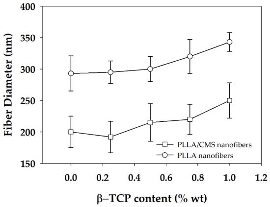The distribution of nanofiber diameter generally changed in the range of 20 to 400 nm for PLLA/CMS with the content of 0.25 to 0.75 wt % of β-TCP. The diameter distribution was increased to approximately 500 nm when the concentration was raised to 1 wt %. The distribution was shifted to the right, as shown, indicating that the diameter of nanofibers was increased with the increase in the composition of β-TCP particles. The increased formation of the cluster due to agglomeration contributes to this phenomenon. Figure 6 demonstrates the average diameters of the PLLA/β-TCP and PLLA/CMS/β-TCP composite nanofibers with the concentration of the β-TCP ranging from 0.25% to 1%. A similar increasing trend was observed with and without the natural polymer of CMS. Siqueira et al. [45] observed a similar trend for the composite PLLA/β-TCP with the composition of β-TCP in the range between 1% to 8%. The average of the nanofiber diameters increased from 260 to 460 nm with the increasing particle content due to the cluster forms in nanofiber structure. The other possible reason that contributes to the increase in diameter is the alteration in the viscosity of the polymer solutions after the addition of β-TCP particles. A higher surface area absorbs liquid during the mixing process and increase the viscosity of the polymers solutions. An increase in viscosity reduces the stretching of the polymer jets during electrospinning and leads to increases in the diameter of the fibers [43,46]. However, the reduction of fiber diameter with the increase of amorphous calcium phosphate (ACP) particles in PDLA fibers was reported by Ma et al. [30] at a certain level of the composition. The increasing of ACP particles to higher composition was found to have no significant effect on fiber diameter. In his report, Ma did not include further discussion on this phenomenon. The breakage, discontinuity, and rough surface of PLLA/HA nanofibers were also observed by Zhao et al. [28]. This effect is more intense at a higher concentration of HA particles. However, Zhao also found out that there was no significant effect on the diameters with the changes in the concentration of HA particles. In our case, we suggest a higher polarity between PLLA/CMS and β-TCP influences the agglomeration effect and the weakness interface bonding between the two.