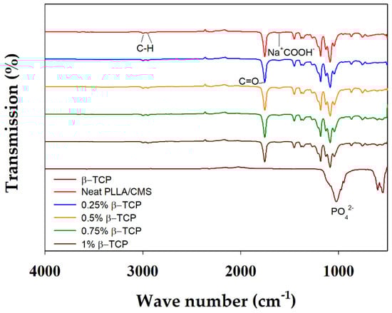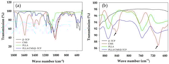 Chemical interactions between the matrix and other component of the composite nanofibers were analyzed by FTIR, as indicated in Figure 7. β-TCP can be characterized by the absorption bands of 946 and 1023 cm−1 that rises from the stretching of symmetry and anti-symmetry of P–O bonding, respectively. The O–P–O bond was indicated at 601 and 547 cm−1 of the absorption band. The low intensity peak of 1085 cm−1 was rising from the portion of crystal structure in the amorphous region [47]. The absorption band of the CMS hydroxyl group appeared at 3200–3400 and 1550–1660 cm−1, and was attributed to the COO−Na+; whereas the absorption peaks of 2995 and to 2945 cm−1 corresponded to C–H in PLLA. Peaks at 1767, 1453, and 1383 attributed to C=O presence in PLLA. The peak of 1023 cm−1 was observed to budge at 1036 cm−1 after the addition of β-TCP into PLLA/CMS (Figure 8a). A possible reason is that it may have resulted from the interface complexes bonding with a hydroxyl group in CMS via oxygen atoms. A similar reaction was observed by Chen et al. [48], a formation of complexes bonds on the surface by the cation transfer between OH groups in CMS and O group in alumina. This condition has resulted in the budging and widening of the FTIR spectroscopy absorption band. The peaks of 839 and 702 cm−1 corresponding to CMS structure were found to vanish, which is attributed to the changes in C–C bond in the polymer network of CMS (Figure 8b). The intensity of the carboxymethyl group, CH2COO−Na+ at 1600 cm−1, was significantly reduced after the concentration of β-TCP was increased. The difference in intensity corresponds to the reduction of the CH2 COO−Na+ by calcium atoms. β-TCP tends to interact with CMS structure compared to the PLLA, but no significant change for the PLLA IR spectrum was observed.