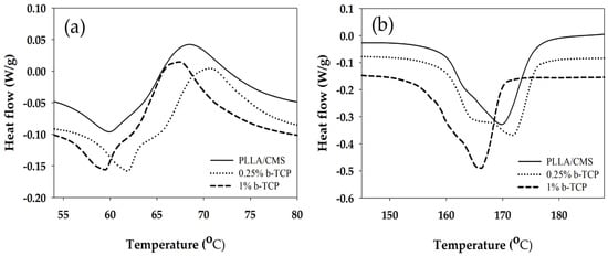 Differential scanning calorimeter (DSC) curves show the (a) glass transition temperature (Tg) and (b) Tm for PLLA/CMS/β-TCP composite nanofibers at different concentration of β-TCP.