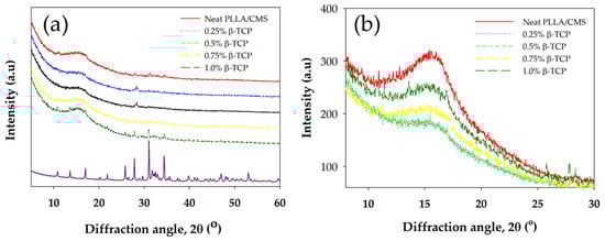 X-ray diffractions spectrum (XRD) of PLLA/CMS/β-TCP composite nanofibers are depicted in Figure 10a,b with a scanning angle ranging from 5° to 60° and 8 to 30°of 2θ. PLLA can be characterized by peaks of 15.2° and 19.0° for plane [110] and [203] of the crystallization peaks. CMS did not show crystallization behavior, indicating the crystal structure has become damaged during the modification process from starch to CMS. Peaks of 27.9, 31.1, and 34.3° indicated the primary peak of crystallization of β-TCP for the primary plane being 214, 300, and 220. Peaks of PLLA fibers were observed to be wider compared to the granules PLLA after the electrospinning process, which would suggest it was due to the stretching of the liquid polymer coupled with rapid solidification. Generally, the XRD spectrum of the composite nanofibers demonstrates a wide peak and this indicates that amorphous structure exists in the composite. The intensity of the PLLA peaks was slightly decreased with the increase of the β-TCP due to the decrease in the degree of crystallization, as indicated in DSC data (Table 1). The peak of 0.25% β-TCP has not appeared in the spectrum, which may be due to too low a concentration in the composite to be detected. The intensity of the peak of the composite nanofibers at 13.5° and 17.0° increased with the increase in the β-TCP content. The peak in the spectrum is contributed to the amount of β-TCP that existed at closer peak to PLLA and is not contributed by polymer crystallization (Figure 9b). The decrease in intensity is also due to combinations apart of amorphous regions of inorganic material in nanofibers [55].