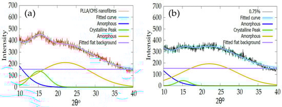 The intensity of the XRD peak of PLLA/HA nanofibers also exhibited a similar pattern after the addition of the HA particle via electrospinning [56]. Kim et al. [41] also found a reduction in intensity and peak widening after calcium phosphate was added to create a gelatin of the nanofibers solution. The possible reason is due to low crystallinity or changes in crystal size to a smaller crystal. Table 2 shows the change in crystallite size with the increase in β-TCP content in the composite nanofiber. The increase in β-TCP in the sample resulted in a decrease in crystallite sizes. The sample with a batch of β-TCP exhibited lower peak intensity and FWHM according to the data compared to the sample without of β-TCP particles. However, at 1% of β-TCP, the crystallite size cannot be obtained. This phenomenon may due to inference with the crystallinity peak of the β-TCP mineral at a high amount (1%). Figure 11a,b show the fitting curves of crystallinity change of the composite with and without the β-TCP particle.
