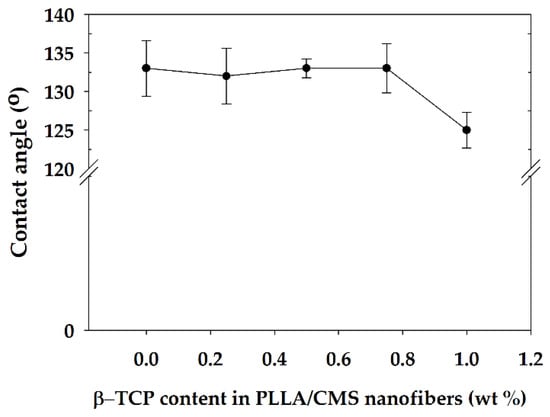 The hydrophilic and hydrophobic properties of the composite nanofibers were analyzed by the water contact angle (WCA). Several studies have indicated that a hydrophilic surface encourages cell adhesion compared to a hydrophobic surface [57]. There was no significant change in WCA for composition 0.25 to 0.75 wt % except for 1% of β-TCP content (Figure 12). WCA reduced from 127.3° to 118° upon the addition of 1% of β-TCP into PLLA/CMS nanofibers, which was reduced by about 11%. Ma et al. [58] found WCA had reduced by about 10% for the changes in β-TCP particles from 10 to 20 wt % in PLLA. A similar observation was reported by Yang et al. [59] in TiO2/PMMA composite film.