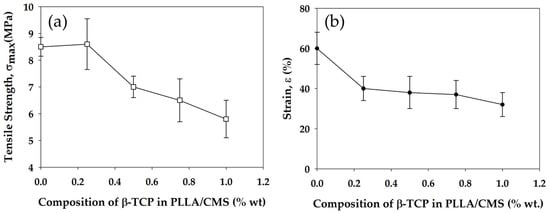 Mechanical strength of the composite nanofibers was measured by the tensile strength test. Generally, the mechanical strength of composite nanofibers decrease with the increase in the β-TCP concentration. There was a slight increase in tensile strength at 0.25% of β-TCP concentration and a decrease from 8.5 down to 5.7 MPa after increasing the content to up to 1%. At lower content, the β-TCP acts as a barrier in molecular movement during the tensile test which results in slight increase (Figure 13a). The weakness in tensile strength with the increase in the β-TCP content can be related to the disruption at both the natural and synthetic polymer structure by the particles. The disruption causes stress concentration at composite nanofibers. The non-uniform particle distribution tends to agglomerate, which damages the structure of individual fibers. Fundamentally, tensile strength has a great relation with the critical defect size in material structure. Weakness in interface bonding between β-TCP and PLLA/CMS led to the weaker tensile strength. Defects and porosity arising from the particles also contributed to the reduction in tensile strength [60].