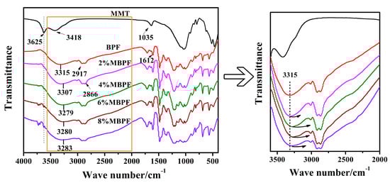 FT-IR of montmorillonite (MMT), BPF and MBPFs.