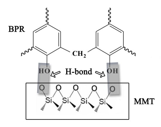 The FT-IR spectra of MMT, the BPF and MBPFs are illustrated in Figure 1, and the functional groups corresponding to the major peaks are identified and listed in Table 2 [21,23,39,40,41]. With respect to BPF, the characteristic absorption peaks at 3315 and 1612 cm−1 are ascribed to phenol O–H stretching and aromatic skeletal vibration, respectively. The absorption peaks at 2917 and 2866 cm−1 are attributed to CH2 stretching vibration. For MMT, the peak at 3625 cm−1 is attributed to the –OH stretching mode bending of Al–OH, while the signal at 3418 cm−1 corresponds to Si–OH bending of MMT. Another large band observed around 1035 cm−1 is assigned to the Si–O stretching (in-plane) vibration of the silicate framework. As seen in Figure 1, all of the modified MBPFs present similar curves in comparison to BPF, indicating that these foams have similar chemical structures. Interestingly, some differences between the MBPFs and BPF are also found. In the MBPFs′ spectra, the absorption peak detected at 3625 cm−1 became more obvious with the increase of the MMT addition rate, possibly due to more Al–OH in the MBPFs after the incorporation of MMT. Moreover, after the addition of MMT, the O–H stretching vibration showed broader peaks and a red shift from 3315 cm−1 to 3307 and 3279 cm−1 compared with BPF. This was likely due to the formation of hydrogen bonding between the OH groups in BPR chains and the layer surface O atoms (Si–O of MMT). The possible schematic of hydrogen bond formation between BPR and MMT is demonstrated in Figure 2. Similarly, this hydrogen bonding between the surface of MMT platelets and OH groups was also found in earlier studies [42,43]. Meanwhile, it should be noted that in the 4% MBPF spectra, the shift of the peak from 3315 (O–H stretching vibration) to 3279 cm−1 was more obvious compared with other spectra, indicating stronger hydrogen bonding between the BPR chains and MMT. In addition, as reported in the literature [44,45], the strong interaction between the BPR chains and MMT corresponded to the good dispersion of MMT in the materials. In other word, the well dispersed MMT with a larger surface area of dispersed phase is beneficial to form hydrogen bonding [45].