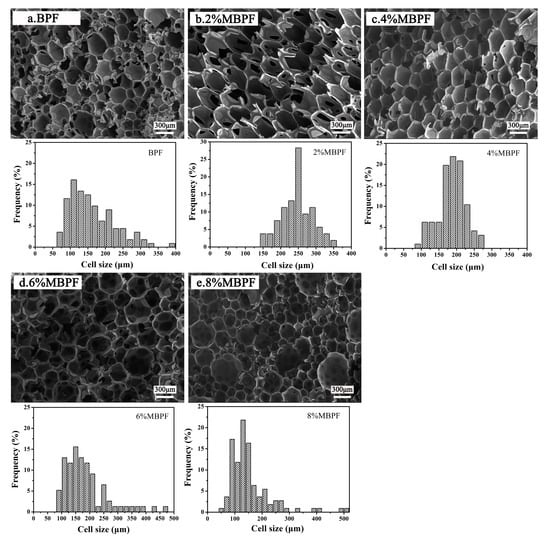 SEM images and cell size distributions of BPF and MBPFs: (a) BPF; (b) 2% MBPF; (c) 4% MBPF; (d) 6% MBPF; (e) 8% MBPF.