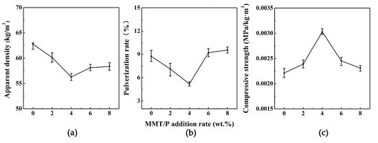 (a) Apparent density; (b) pulverization rate and (c) compressive strength of BPF and MBPFs.