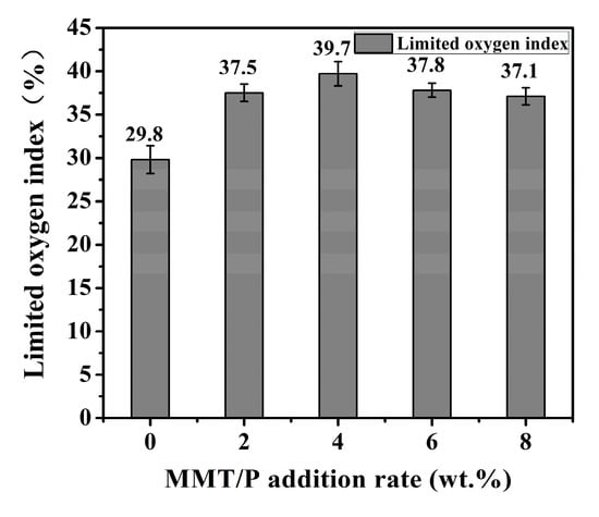 LOI is an important parameter which is widely used to assess the flammability of materials. The effect of MMT on the fire resistance of BPF was investigated by LOI testing. As shown in Figure 5, the BPF presented the lowest LOI value at 29.8%, indicating poor inflammability. Fortunately, the addition of MMT into the BPF system induced significant improvement on the flame resistance for MBPFs, and all the LOI values were higher than the B1 standard value (≥30%), according to the China National Standards GB/T 8624-2012 [55] and the European Standard EN13501-1:2007 [56], which means that MBPFs have superior flame-retardancy. The LOI values initially increased with the increasing addition rate of MMT until a maximum was attained and then decreased. The MBPF exhibited the highest LOI value at 39.7% when MMT was loaded at 4 wt %, leading to a 33.2% improvement compared to that of BPF. Several factors could explain the strengthening inflammability effect of the MMT modifier to BPF. First, the tortuous paths created by the complex orientation of MMT layers reduced heat radiation and conduction [57]. Second, the interaction between MMT and BPR increased the viscosity, inhibiting the droplet in the combustion process and limiting the spread of the flame. Third, the further formed MMT-based char layer at high temperature had a more compact and orderly intercalation structure, thereby acting as an effective protective shield on the BPF surface to delay the transfer of oxygen, heat, and volatile gases between the flame and underlying matrix. Last, the well dispersed MMT improved the compatibility between MMT and BPR [58].