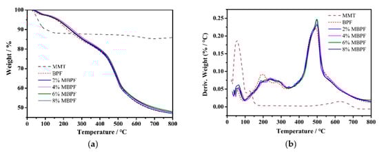 (a) TG and (b) DTG curves of BPF, MBPFs, and MMT.