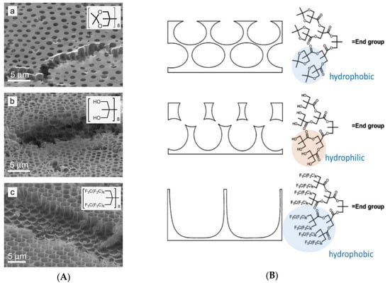 Honeycomb-like films fabricated with various end groups based on bis-MPA dendrons: (A) SEM micrographs of the honeycomb-like film made from star-shaped dendron-functionalized with a. acetonide-functionalized G3 star polymer; b. hydroxyl-functionalized G3 star polymer; c. perfluoroalkyl-functionalized G3 star polymer. Insets show end-group structure; (B) schematic representation of honeycomb films change with the end groups [45]. © Reproduced with permission from Wiley.