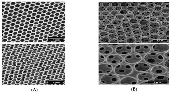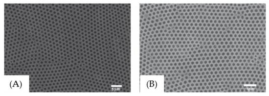 TEM images of PVPh-b-PS honeycomb-like films [105]: (A) 20 mg in THF + 0.1 mL toluene; (B) 50 mg in THF + 0.1 mL toluene. © Reproduced with permission from Elsevier.