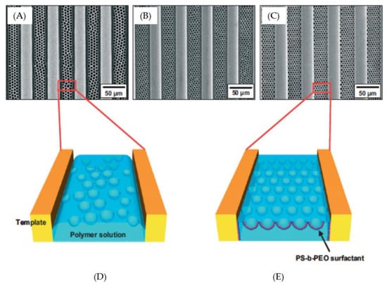 SEM images of various polymeric surfactants of polystyrene-block-poly(ethylene oxide) contains, in a 4.0 wt% polystyrene polymer solution: (A) 0 wt%; (B) 0.4 wt%; (C) 0.8 wt%. (D,E) Schematic comparisons of the (D) poor wetting between the polymer solution and grating surface, and (E) the red chain indicates the addition of hydrophilic PEO blocks and the blue chain indicates the hydrophobic PS blocks [31]. © Reproduced with permission from Wiley.