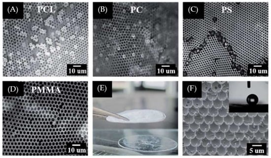 Images of honeycomb-like surfaces obtained from the BF process (95% RH) based on a polymer solution comprising dendron (A3) in chloroform (10 mg/mL) [28]: (A) A3/PS; (B) A3/PCL; (C) A3/PC; and (D) A3/PMMA from microscope; (E) photograph of free-standing A3/PMMA film; and (F) image of the superhydrophobic surface of the A3/PS honeycomb-like film after the peeling-off process. © Reproduced with permission from the Royal Society of Chemistry (RSC).
