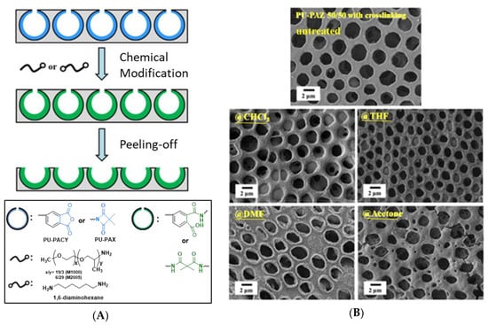 Schematic representations of crosslinked honeycomb-like films [26]: (A) Reactive pendent units of PUs; (B) images of crosslinked honeycomb-like films for solvent treatment. © Reproduced with permission from Elsevier.