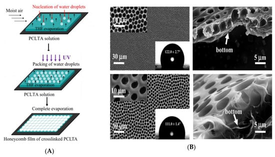 An UV-curable poly(ε-caprolactone) triacrylate (PCLTA) was developed for regulating cellular behavior by Wu et al. [43]. Honeycomb-like films were fabricated from PCLTA solution via the BF method with photo-curing (Figure 10). It is worth noting that the volatile, water-miscible, relatively non-toxic solvent tetrahydrofuran (THF) was utilized in the study. The obtained biocompatible crosslinked PCLTA honeycomb-like films were also evaluated for mouse pre-osteoblastic MC3T3-E1 cell adhesion, spreading, proliferation, differentiation, and gene expression.